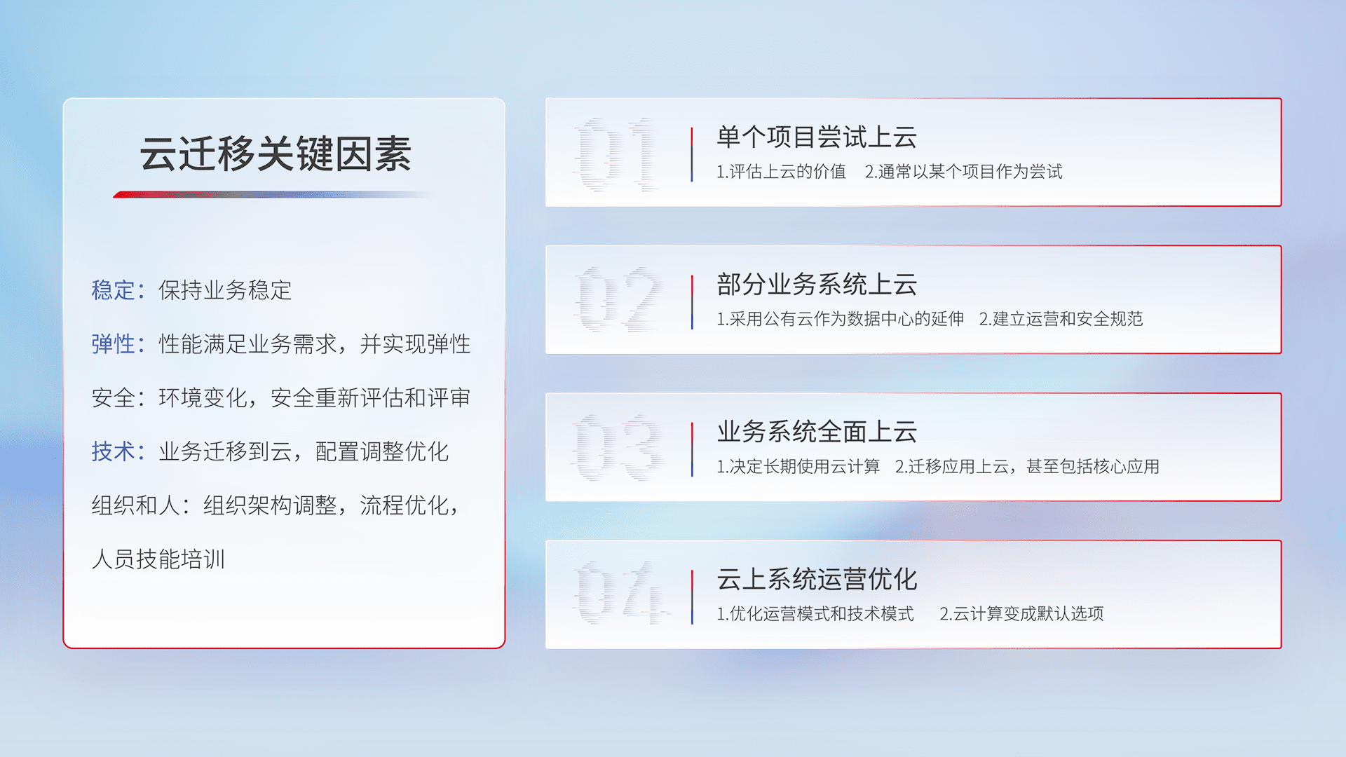 结合实际业务,,从规划设计、、、、云平台选型、、、云原生改造、、、数据迁移、、集成交付,,,,迁移全过程为客户识别最佳上云路径,,做好风险识别管理,,设计网络架构、、、、身份权限、、、、安全审计合规、、、、操作审计、、、、日志审计、、监控告警策略、、、、多站点容灾设计等,,,对云上基础设施进行整体规划,,提升IT治理水平,,以满足弹性、、、高可用、、高性能的需求。。。